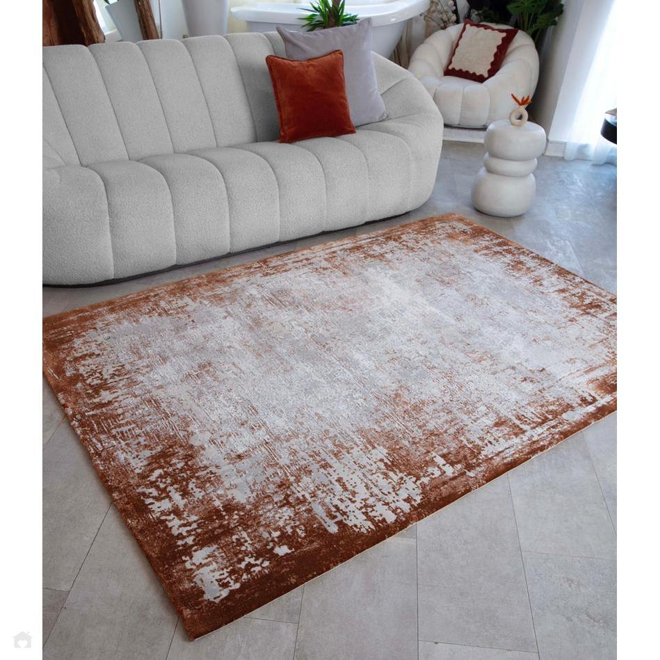 Its abstract distressed pattern is framed by a rich terracotta border, giving the piece structure and warmth. The combination of terracotta, light grey, and cream creates a warm yet contemporary colour palette, ideal for bringing vibrancy and depth to modern interiors.