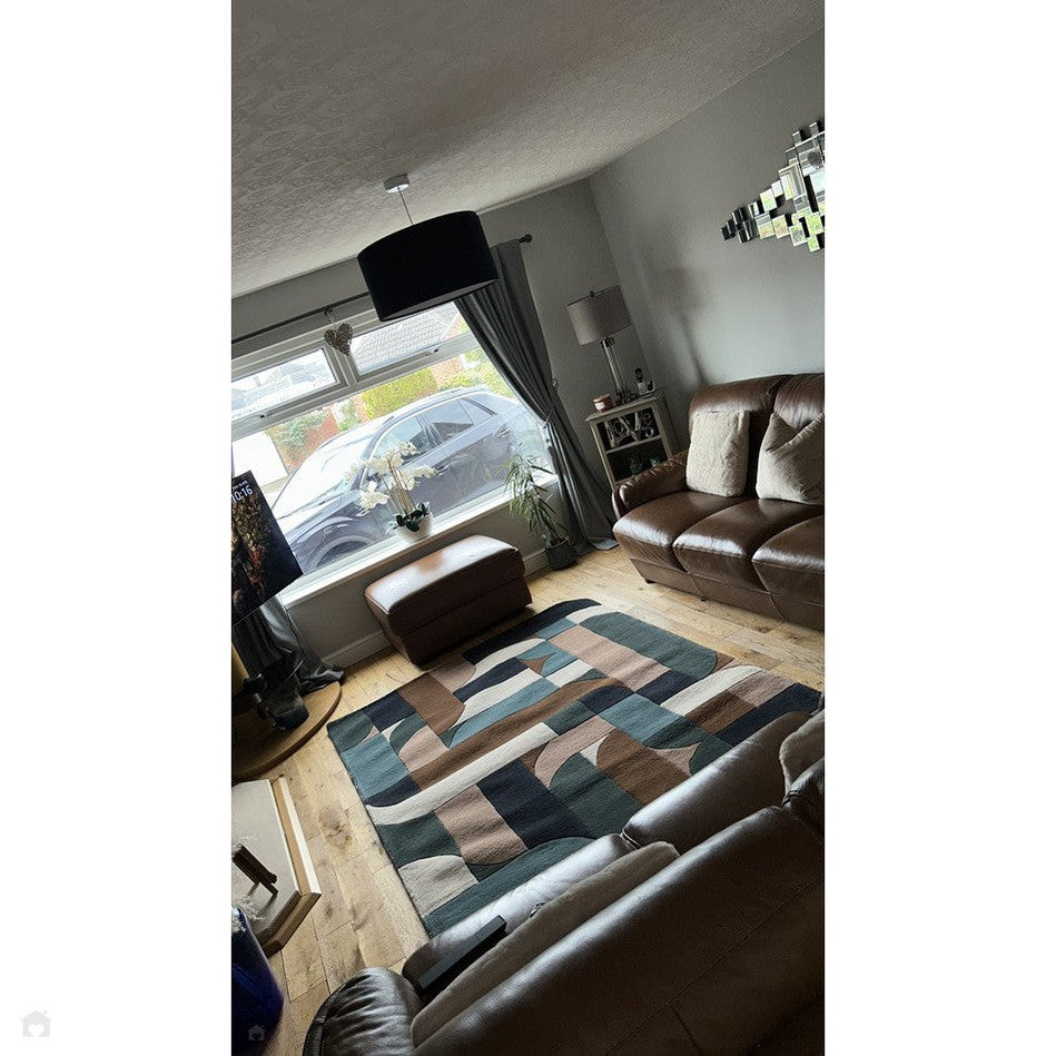 The Matrix MAX89 Klotski Modern Geometric Rug weaves together Teal Blue, Navy Blue, Ivory, Taupe, Chestnut Brown, and Dark Charcoal in a beautifully orchestrated pattern of intersecting shapes. The contrast between matte wool fibres and the subtle sheen of viscose enhances the sense of dimension and light movement across the surface.