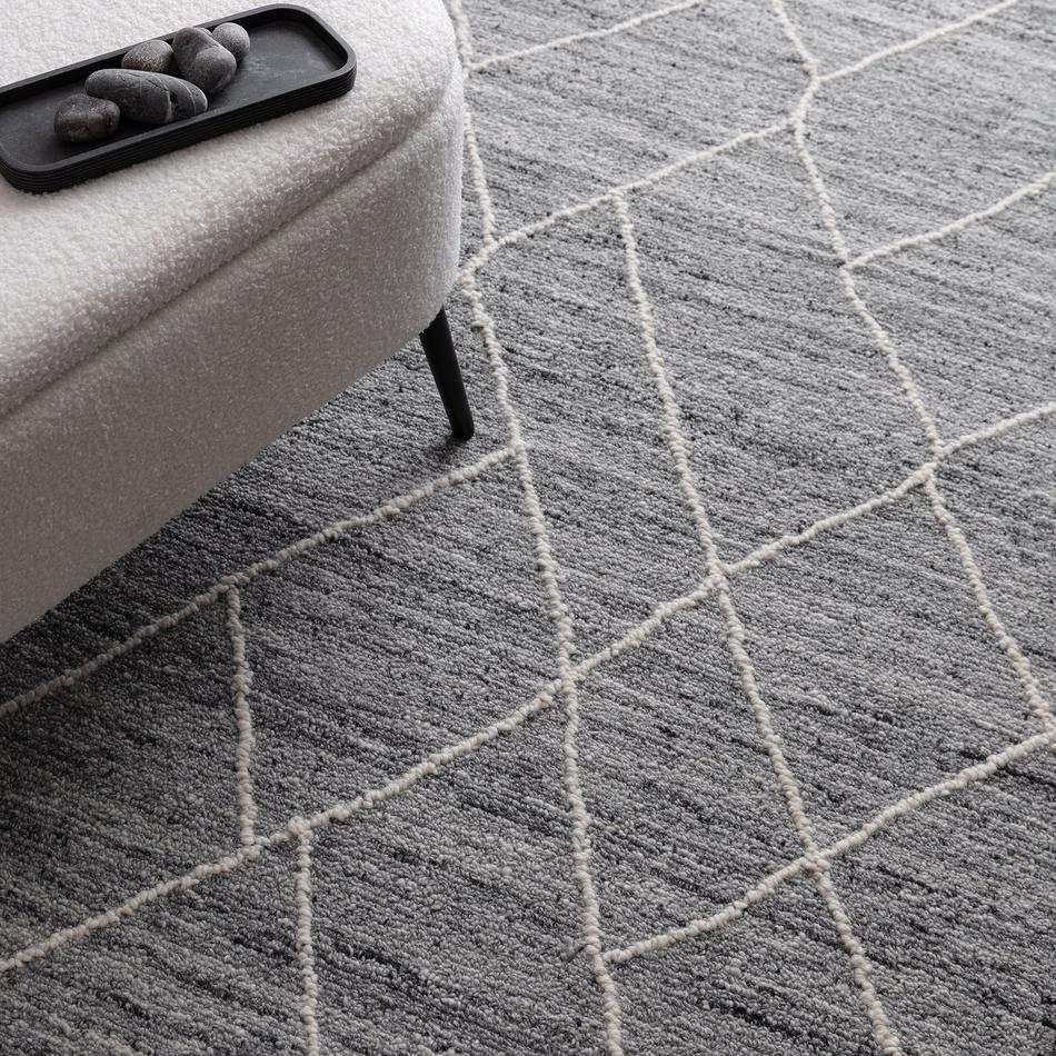 The Noah Hand-Tufted Wool Rug combines a classic Moroccan-inspired motif with the beauty of natural, undyed wool. Featuring a charcoal grey base with a crisp ivory diamond lattice pattern, this rug brings a sophisticated yet relaxed look to modern and boho interiors. Its hand-tufted 100% wool construction delivers a luxuriously soft underfoot feel, while the 8–12 mm pile height adds warmth and texture. Perfect for grounding a living room, bedroom, or cosy nook, this rug embodies understated elegance and sustainable style.