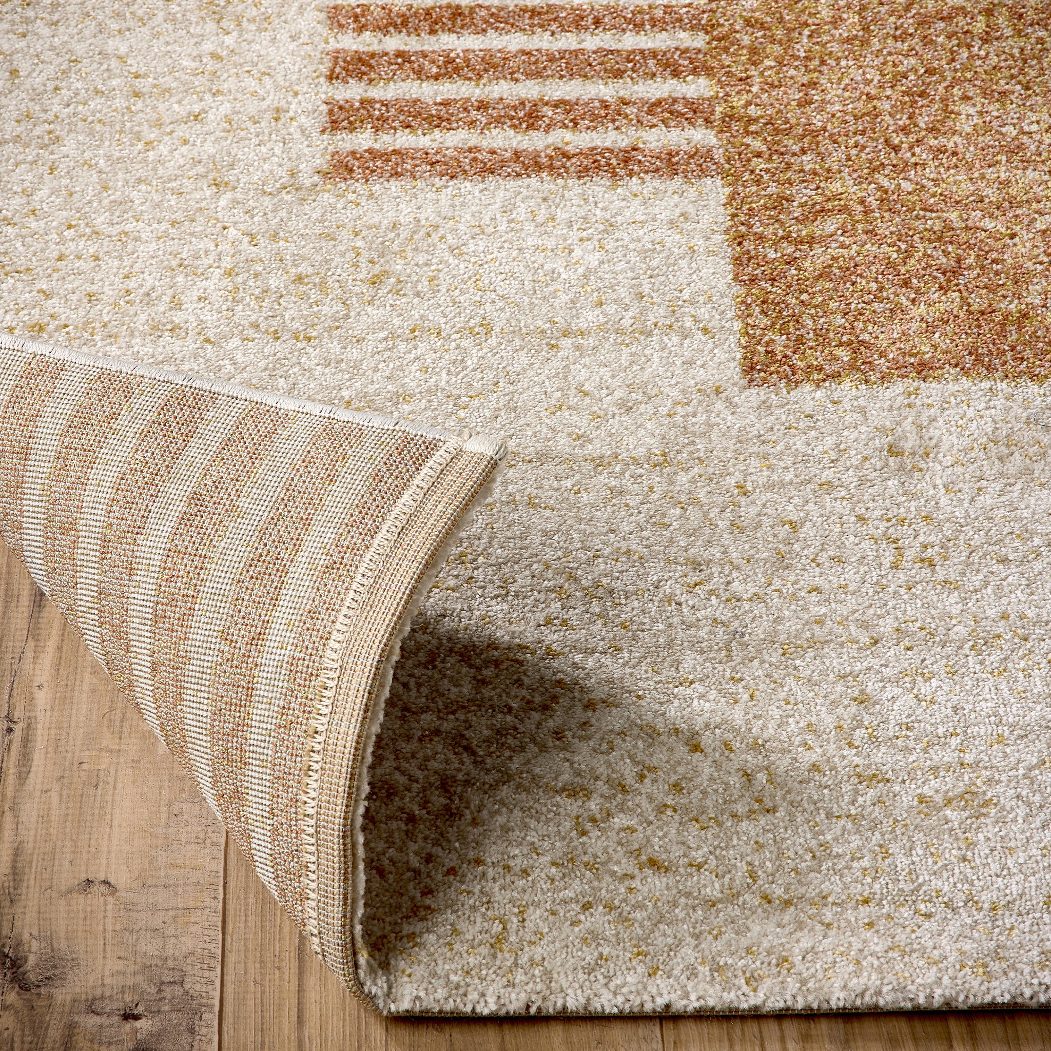 Our Nomad Block design features a repeated abstract striped design in a terracotta colour on a beige background. Made from polypropylene, this rug is hardwearing and made for busy homes.