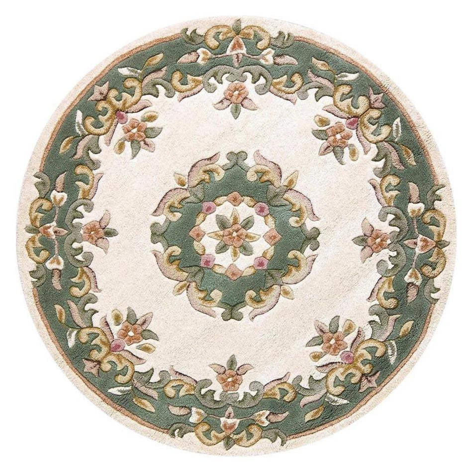 Royal Traditional Floral Aubusson Medallion Border Wool Round Rug in Cream & Green. The Royal Traditional Floral Aubusson Medallion Border Rug in Cream & Green is the perfect choice for those seeking a timeless and elegant centrepiece for their home. The soft cream base provides a serene foundation, while the deep forest green border frames the intricate floral motifs and medallion design, creating a balanced and sophisticated aesthetic.