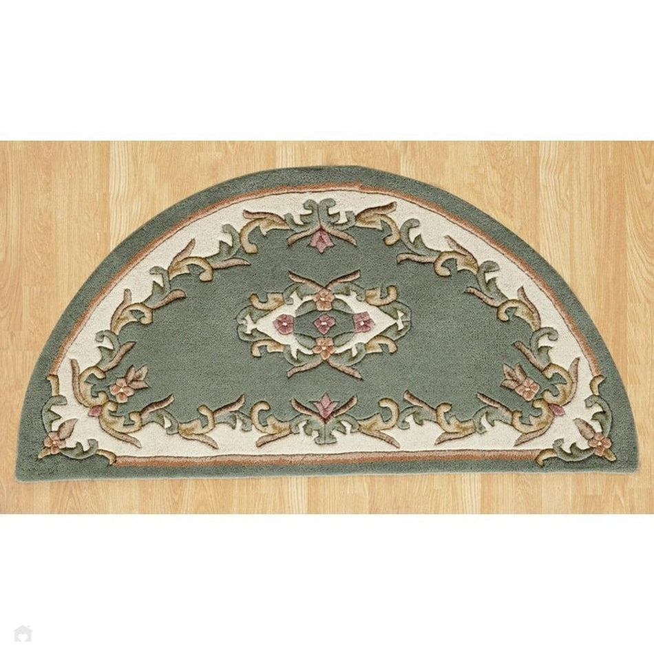 Royal Traditional Floral Aubusson Medallion Border Wool Half Moon Rug in Green. Enhance your home with the Royal Traditional Floral Aubusson Medallion Border Rug in Green, a piece that blends elegance, tradition, and comfort. Its soft green background invites a calming, refined atmosphere, making it the perfect choice for those seeking to bring both warmth and sophistication to their living space.