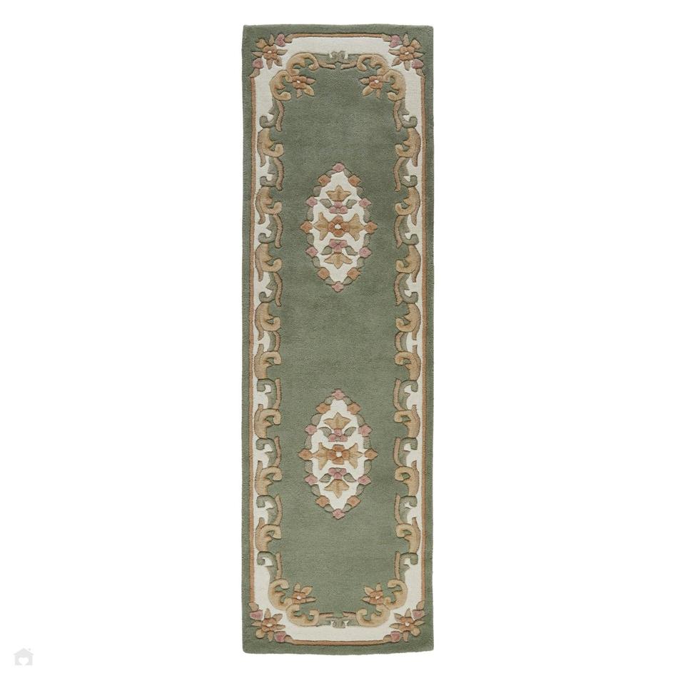 Royal Traditional Floral Aubusson Medallion Border Wool Runner in Green. Enhance your home with the Royal Traditional Floral Aubusson Medallion Border Rug in Green, a piece that blends elegance, tradition, and comfort. Its soft green background invites a calming, refined atmosphere, making it the perfect choice for those seeking to bring both warmth and sophistication to their living space. This rug showcases a beautiful central medallion, surrounded by a delicate floral and scrolling border, with accents of blush pink, cream, muted gold, and sage green. Expertly hand-tufted from 100% pure wool and hand-carved in India, this rug is designed to deliver both luxury underfoot and timeless visual appeal.
