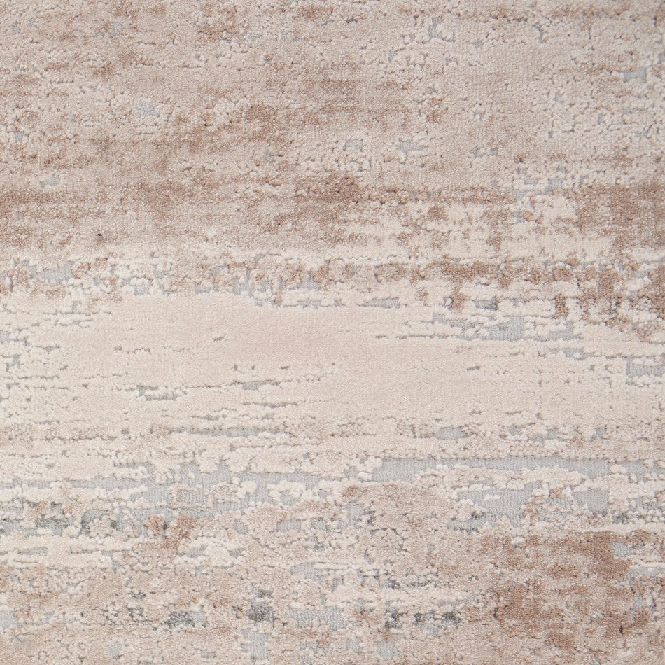 This rug features a modern abstract distressed pattern in a warm palette of beige, ivory, taupe, sand, and metallic silver. The subtle shimmer and carved high-low texture create depth and visual intrigue, making it an elegant choice for both contemporary and classic interiors. Its neutral tones blend seamlessly with a variety of décor styles, adding understated luxury and warmth to any space.