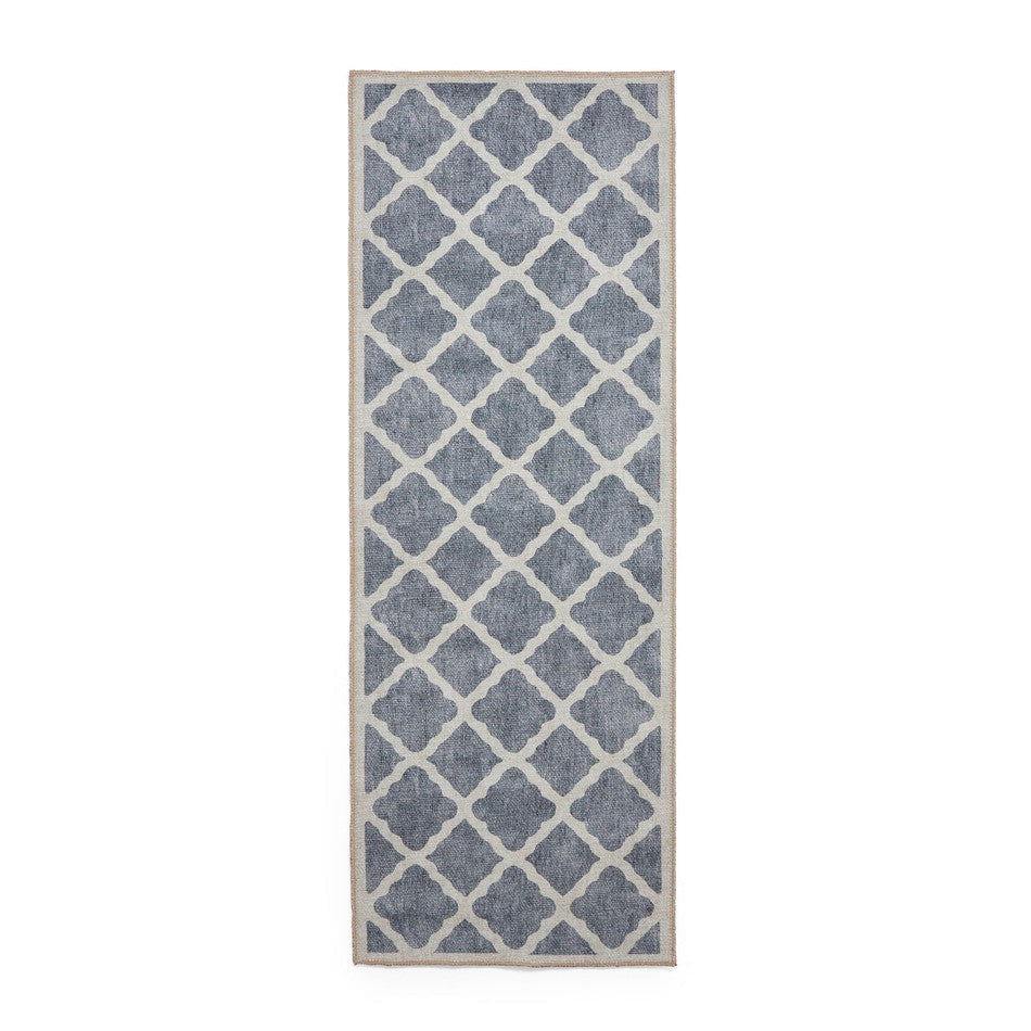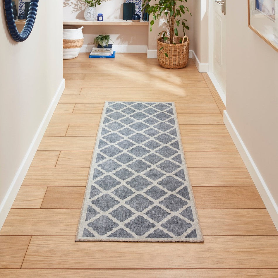 The Washable Coral H1063 Grey Runner brings a calm, modern aesthetic to any space, defined by a geometric lattice pattern in Steel Grey-Blue, Slate Grey, Light Grey, and Ivory. Its flatweave, low-profile construction provides a smooth surface and subtle texture, complemented by digitally printed detailing that enhances tonal definition. Made in Turkey from mixed recycled polyester, this lightweight and fully washable rug combines style, sustainability, and practicality, ideal for kitchens, living rooms, and contemporary interiors. With its 0.2cm slim profile, it offers easy maintenance and a refined, understated finish that complements neutral or cool-toned décor schemes.