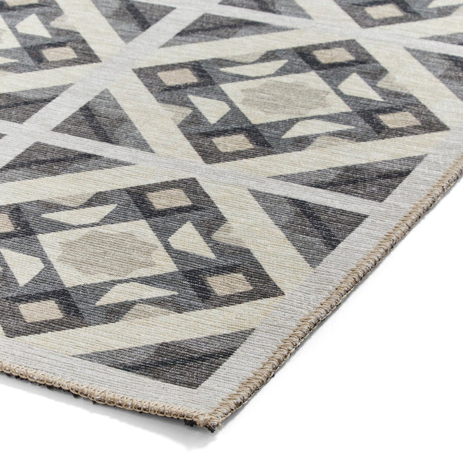 The Washable Victoria H1187 Grey/Beige Rug features a sophisticated mix of Charcoal Grey, Stone Grey, Beige Taupe, and Ivory arranged in a diamond tile and star lattice pattern that evokes traditional encaustic flooring with a modern twist. Its flatweave, low-profile construction provides a clean, contemporary look enhanced by digitally printed detailing for crisp, long-lasting colour. Made in Turkey from mixed recycled polyester, this lightweight and fully washable rug unites eco-friendly design with practical everyday performance. Perfect for kitchens, hallways, and living spaces, the 0.2cm slim profile and anti-slip backing ensure both stability and style in any modern home.